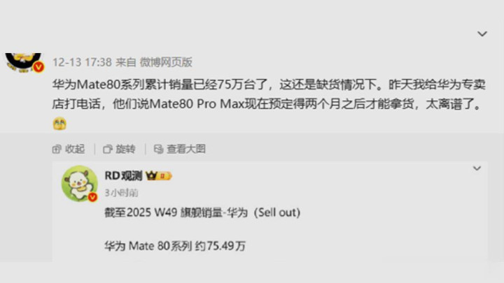 网传华为Mate 80系列两周内销量破75万